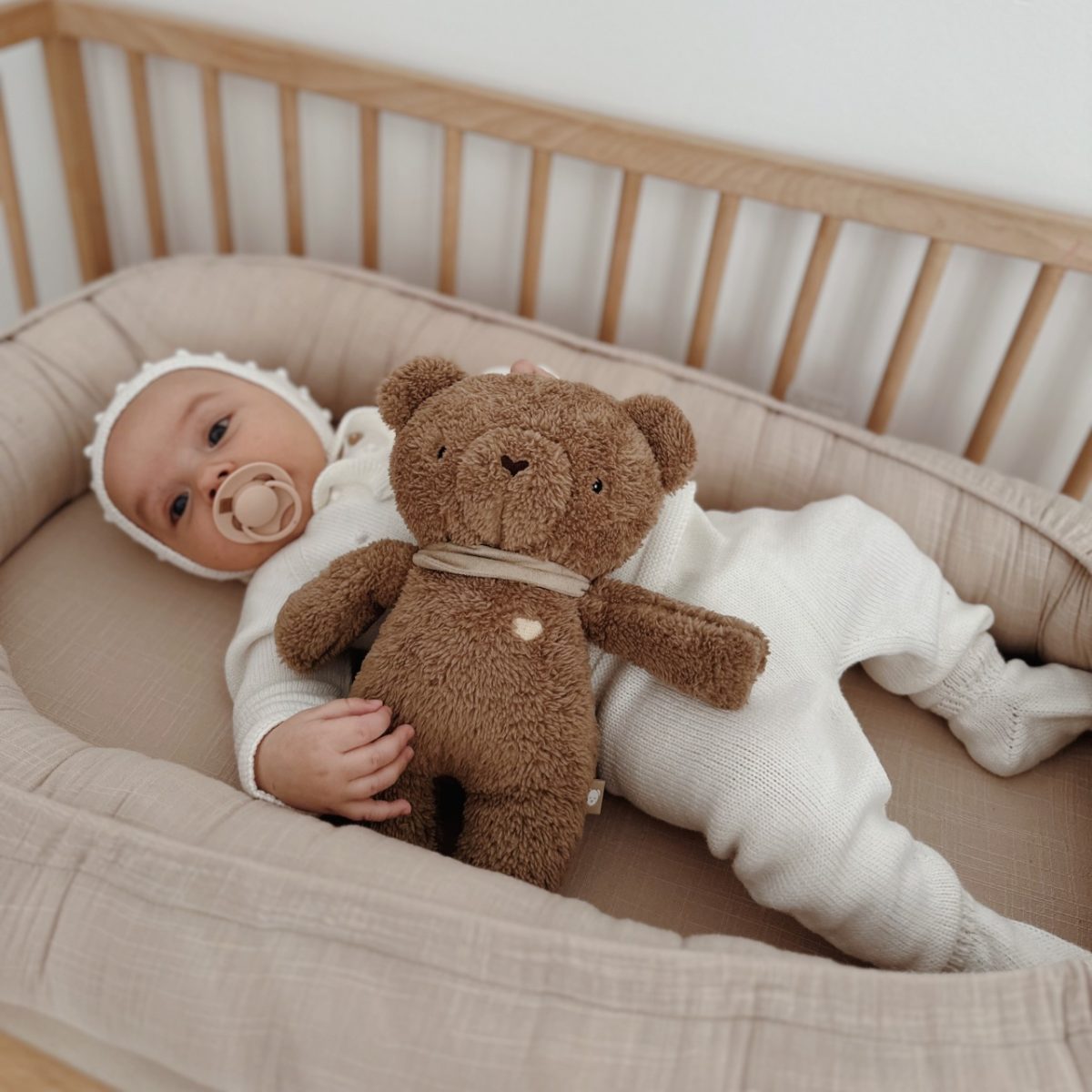 Disponible en 2 coloris doux – beige et marron – l’Ours MyHummy s’intègre facilement dans la chambre de bébé tout en devenant un compagnon rassurant nuit après nuit.