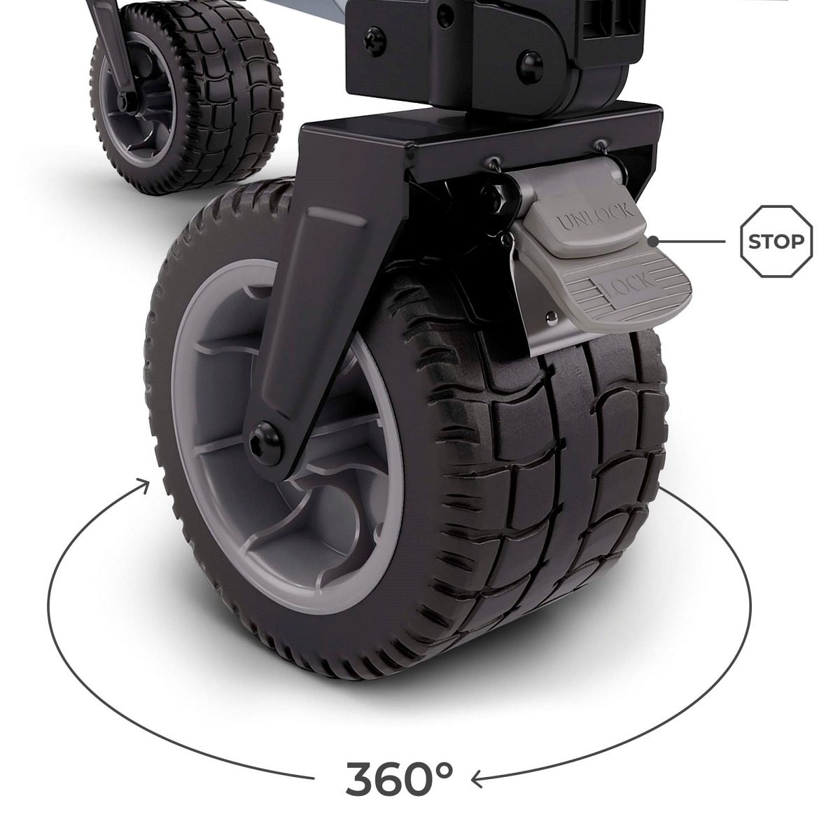 Ses grandes roues de 10 cm de large franchissent facilement le sable, l’herbe, le gravier et les petites irrégularités, pour des promenades en famille confortables, peu importe le terrain.