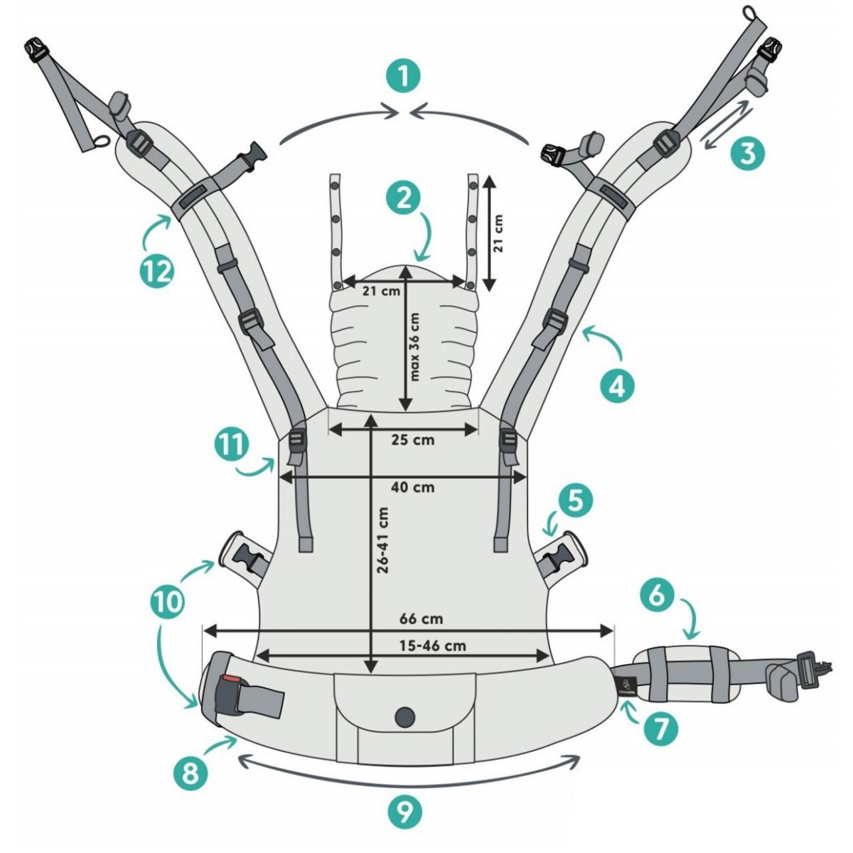 - Réglage de la longueur des bretelles – permet d’adapter parfaitement le porte-bébé à votre morphologie.