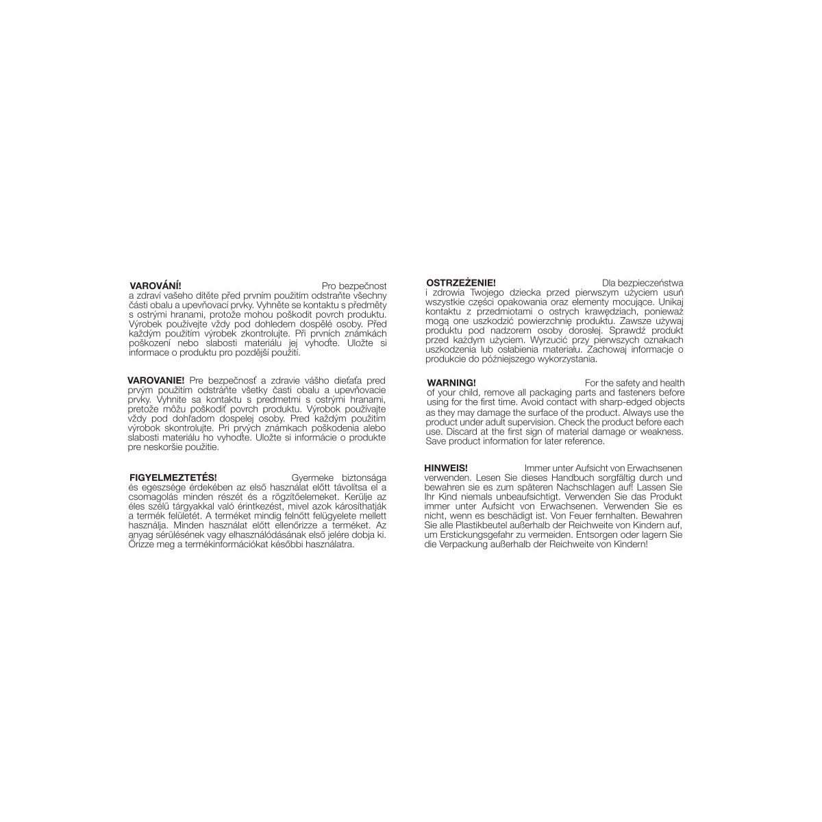 - Avertissement - Avant l´utilisation, enlevez ou gardez hors d´atteinte des enfants toutes les parties de l´emballage du produit (pochettes, sacs plastics, cordons…). Danger d'étouffement!.