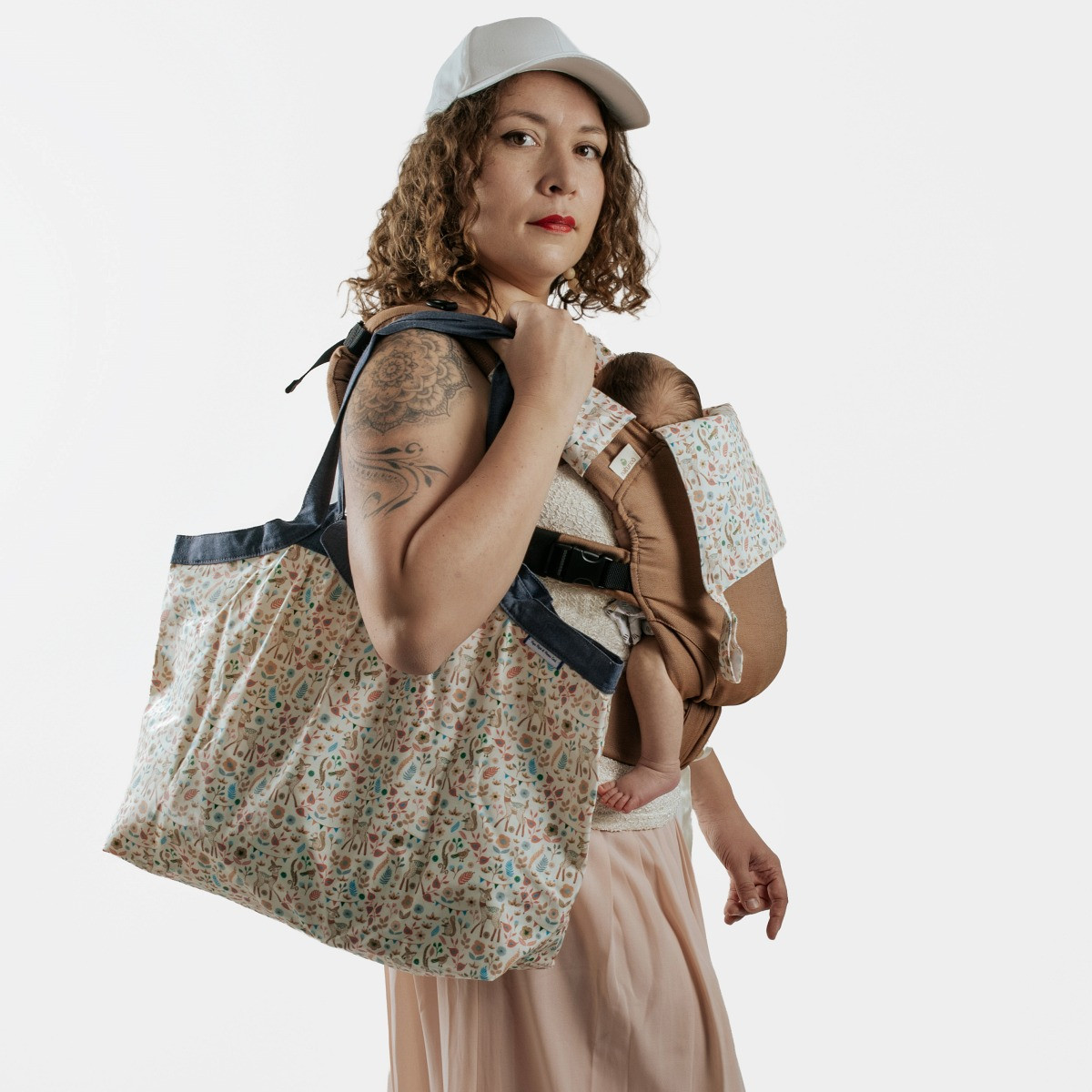 Une combinaison chaleureuse et féerique. Le porte-bébé brun évoque les teintes naturelles de l’écorce, tandis que le tissu Douceurs des bois apporte une touche bucolique avec ses motifs animaliers et floraux.