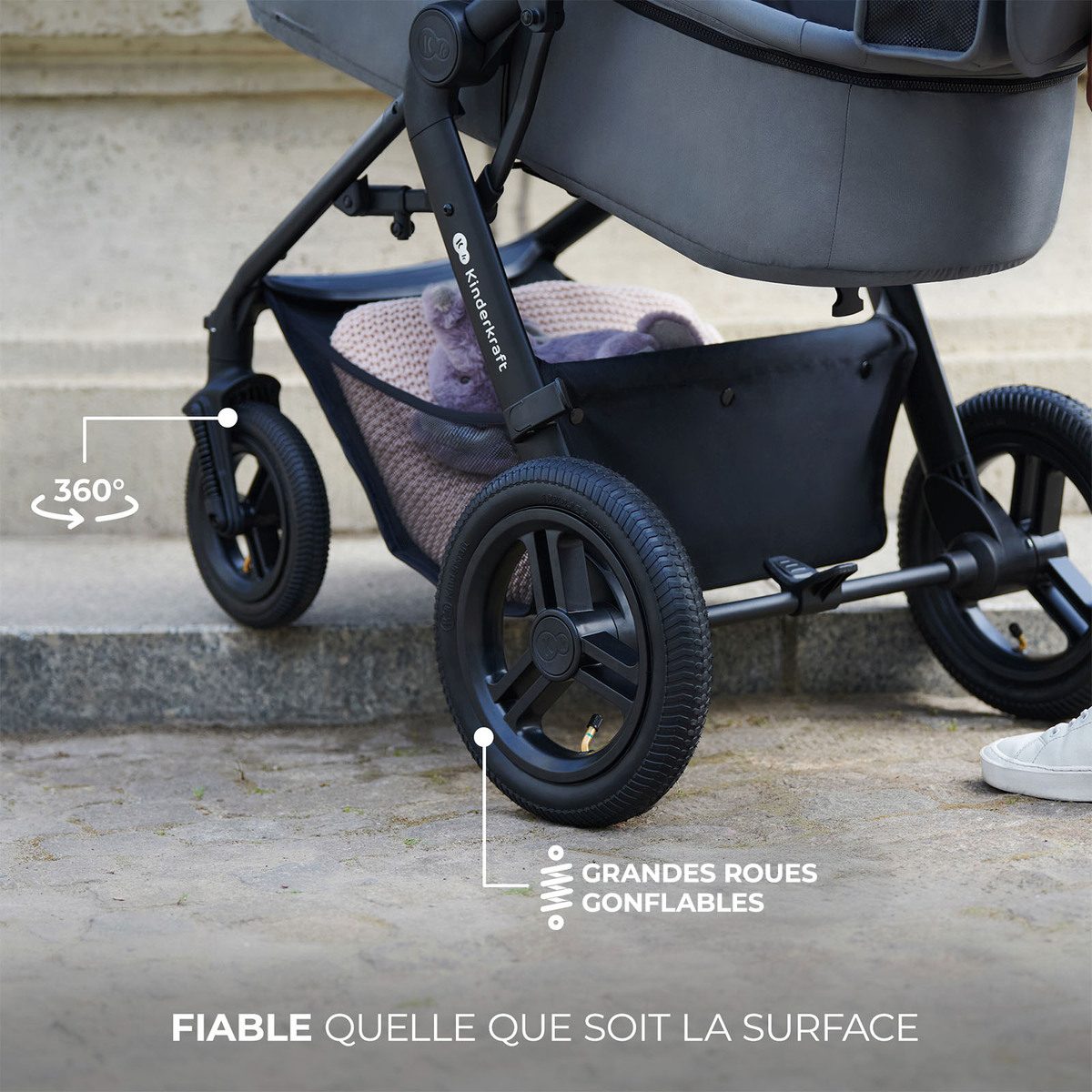 La poussette MOOV 2 AIR est équipée de grandes roues gonflables avec amortisseurs, pensées pour offrir un confort optimal aussi bien en ville que lors de balades hors des sentiers battus. Grâce à leurs pneus épais, elles absorbent efficacement les chocs et garantissent une conduite fluide, même sur les trottoirs irréguliers ou les terrains accidentés.