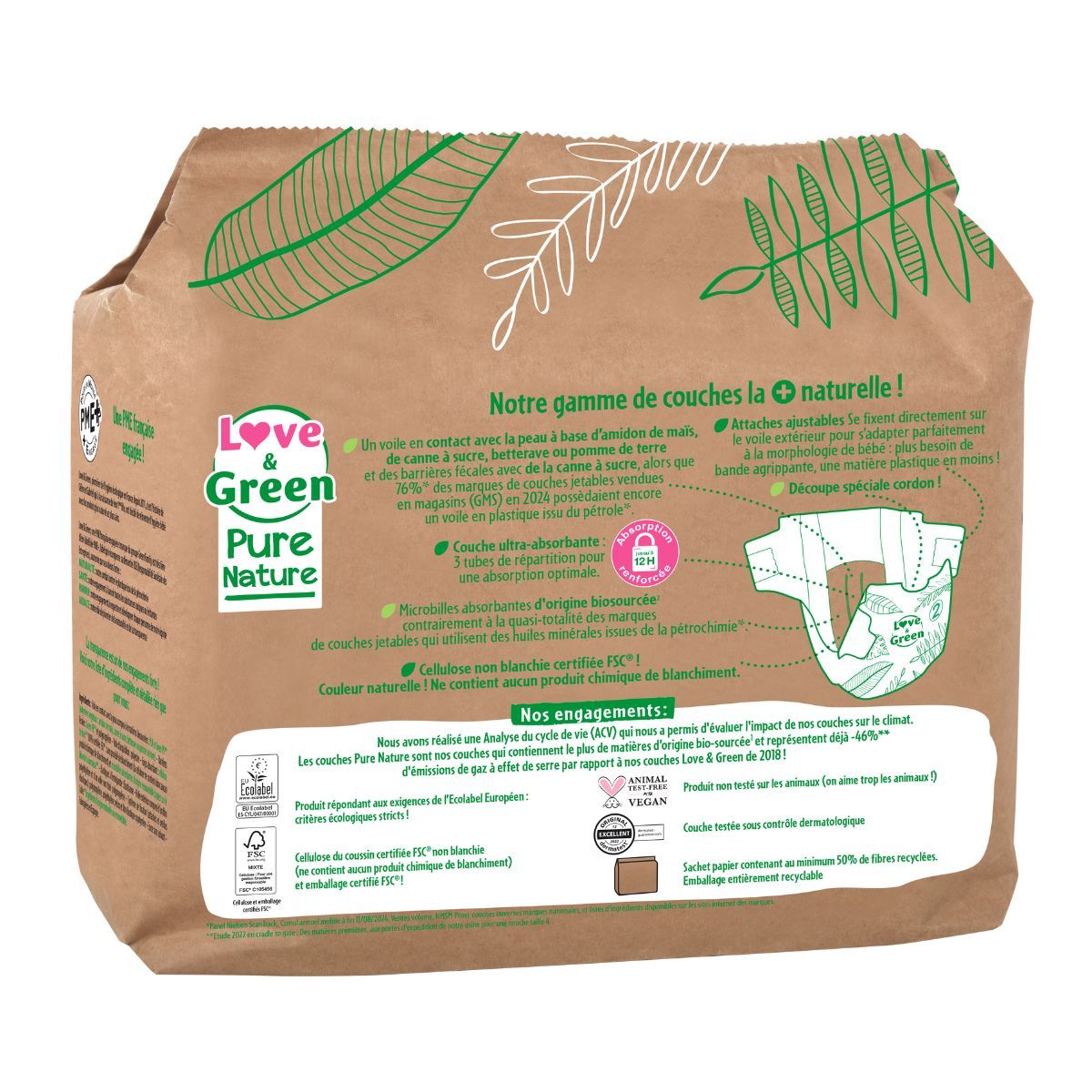 Love and Green, Pure Nature, Taille 2, couches hypoallergéniques x 35